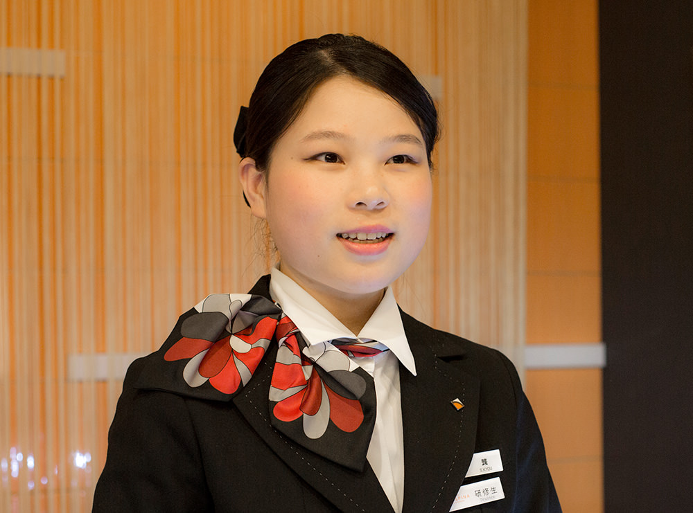 専門学校では主に観光・レジャービジネスを学んでおり、当初は観光業での就職を考えていました。しかし近年日本へ訪れる中国人観光客が激増しており、最近では旅行会社のツアーではなく自分で計画を立てる個人旅行が増えている傾向があることから、お客様と接する機会が多いホテルで働きたいと思うようになりました。何よりも自分の母国語を最大限にいかすことができます。